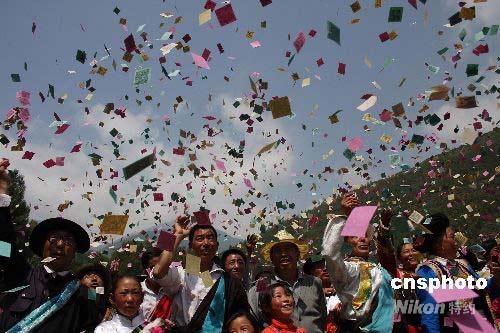 圖:藏族群眾拋灑龍達(dá)感謝支援者