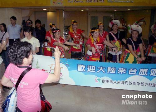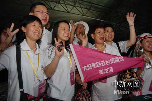 圖:大陸居民赴臺(tái)旅游首發(fā)團(tuán)抵松山機(jī)場(chǎng)