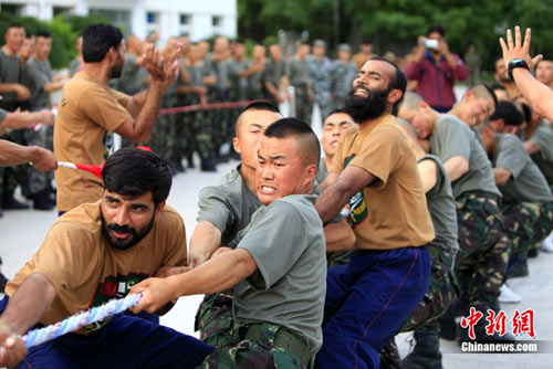 7月初,代號(hào)“友誼—2010”的中國(guó)巴基斯坦反恐聯(lián)合訓(xùn)練在中國(guó)寧夏青銅峽地區(qū)展開(kāi),此次訓(xùn)練主要以邊境地區(qū)山地聯(lián)合反恐作戰(zhàn)為課題。開(kāi)訓(xùn)以來(lái),參訓(xùn)官兵每天不論是訓(xùn)練交流還是開(kāi)展文體活動(dòng),都混編為A連和B連為單位組織實(shí)施,盡管語(yǔ)言溝通并不暢通,但中巴兩國(guó)士兵在手勢(shì)和眼神的幫助下,依然能夠協(xié)作訓(xùn)練默契自然,完成動(dòng)作標(biāo)準(zhǔn)規(guī)范。中新社發(fā) 杜洋 攝