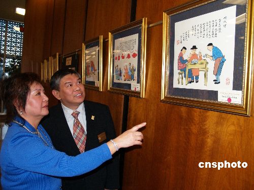 2008年1月9日,華人聚集的洛杉磯阿罕伯拉市舉行中國年畫拍賣會,為阿罕伯拉市高中籌集教育基金。成都女畫家陳雪梅的12幅鼠年年畫,為美國中學生籌得近5000美金。阿罕伯拉市華裔市長沈時康、拍賣活動負責人陳惠萍欣賞中國年畫。中新社發(fā) 盧威 攝