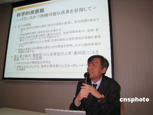 1月19日,由早稻田大學(xué)中國塾(研究會)主辦的2008年新春演講會,在早稻田大學(xué)國際會議中心舉行,百余人與會。旅日華人學(xué)者、知名中國經(jīng)濟專家關(guān)志雄博士進行演講。圖為關(guān)志雄在介紹中國的科學(xué)發(fā)展觀。中新社發(fā) 段躍中 攝