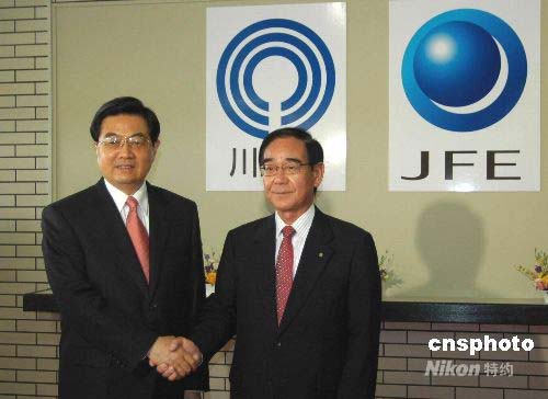 5月9日上午10時(shí)20分,正在日本進(jìn)行國(guó)事訪問的中國(guó)國(guó)家主席胡錦濤來到神奈川縣川崎市的日本JFE工程技術(shù)株式會(huì)社下屬川崎環(huán)保工廠參觀,受到該廠員工們熱烈歡迎。圖為胡錦濤主席與前來迎接的川崎市市長(zhǎng)阿部孝夫(右)握手留影。中新社發(fā) 關(guān)妍 攝