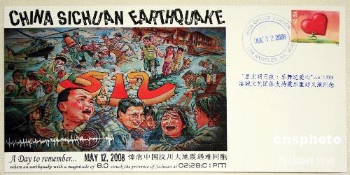 當地時間7月12日,美國洛杉磯華人華僑,為紀念中國四川省汶川縣發(fā)生8級地震,悼念地震遇難同胞,舉辦了“星光明月夜,樂舞送愛心”洛城文藝團體支持震后從建紀念活動,并發(fā)行首日封一枚。圖為首日封設計者魏進發(fā)。中新社發(fā) 金立冬 攝