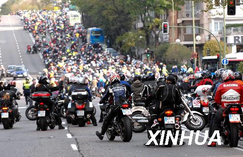 11月8日,眾多摩托車手在西班牙首都馬德里市中心街道參加大游行。當(dāng)日,來自西班牙各地的上萬名摩托車手在首都馬德里參加大游行,呼吁政府部門改善道路交通條件,保障摩托車出行安全。據(jù)統(tǒng)計(jì),西班牙2007年共有500余名摩托車手在交通事故中喪生。新華社記者陳海通攝