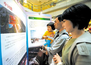 相比往年,本次“上海與上海世博會”圖片展首次利用了羽田機(jī)場這一重要交通窗口作為展示平臺。羽田機(jī)場1號出發(fā)大樓2樓大廳內(nèi),100多幅精心挑選的照片巨大而醒目,多媒體的宣傳片循環(huán)播放,讓機(jī)場成了一個(gè)“上海世博推介臺”。展區(qū)門口,“海寶”揮手迎客,可愛的模樣煞是惹人喜歡,孩子們紛紛上前拉拉“海寶”的手、親親“海寶”的臉。圖片展示成了機(jī)場內(nèi)的一個(gè)焦點(diǎn),眾多來往旅客紛紛駐足觀看,舉辦方則在不停地派發(fā)世博宣傳資料、贈(zèng)送世博小禮品,氣氛十分活躍。