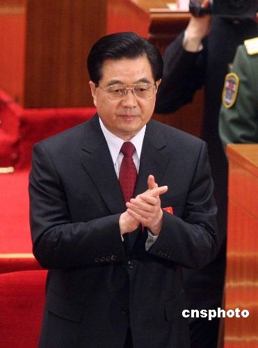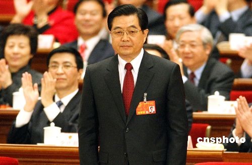3月15日上午,十一屆全國人大一次會(huì)議第五次全體會(huì)議在北京人民大會(huì)堂舉行,胡錦濤再次當(dāng)選中華人民共和國主席、中華人民共和國中央軍事委員會(huì)主席。中新社發(fā) 張宇 攝