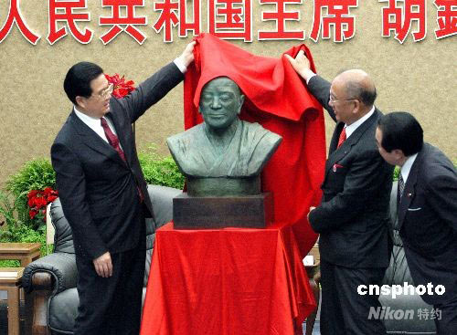 正在日本進行國事訪問的國家主席胡錦濤,十日與奈良地方官員一起為鑒真大師銅像揭幕。中新社發(fā) 陳超 攝