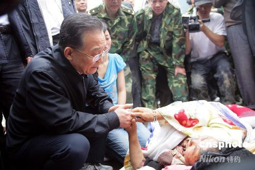 5月14日下午,國務(wù)院總理溫家寶前往重災(zāi)區(qū)映秀鎮(zhèn)看望災(zāi)民。中新社發(fā) 劉震 攝