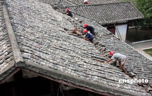 圖為施工隊伍正抓緊修復明月小學的部分教室。2008年5年12日四川汶川大地震波及華鎣市,震感強烈,致使該市學校大面積不同程度受災,據統(tǒng)計,有11所學校受災,受損面積8200平方米,損失680萬余元,致使近1500名學生不能正常行課。災情發(fā)生后,四川華鎣市委市政府立即組織市教育局和各學校迅速行動,啟動了應急預案,各級領導在第一時間分赴受災學校指揮指導抗災救災工作,確保了師生生命財產安全,無一例地震傷亡事故發(fā)生;同時,他們在組織專家鑒定后,立即籌集資金,組織施工隊伍修復損壞不大的教室,使學生盡快復課。