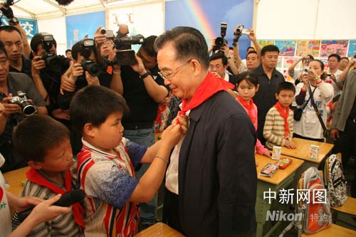 五月二十三日,正在四川地震災(zāi)區(qū)考察的國(guó)務(wù)院總理溫家寶來到綿陽(yáng)九洲體育館,看望九洲帳篷學(xué)校的孩子們。圖為孩子們?yōu)闇丶覍毾瞪霞t領(lǐng)巾。中新社發(fā) 齊彬攝