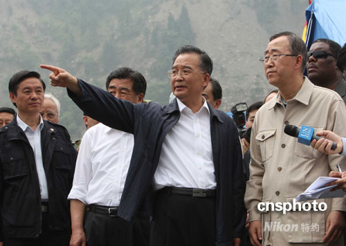 溫家寶向潘基文介紹映秀鎮(zhèn)地震災(zāi)區(qū)情況