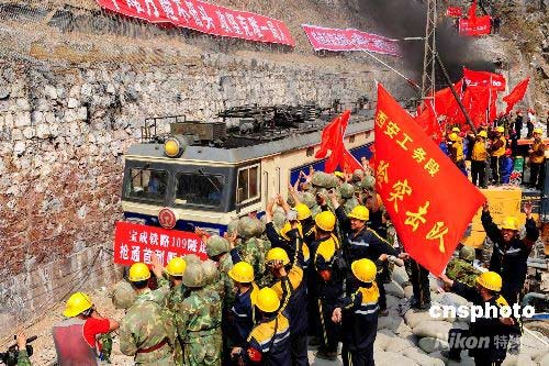 5月24日上午,首列滿載運(yùn)往四川災(zāi)區(qū)救災(zāi)物資的搶977次列車,從寶成線徽縣至虞關(guān)站間109號(hào)隧道安全通過,這標(biāo)志著因地震塌方在隧道內(nèi)脫線起火、中斷行車283小時(shí)的寶成鐵路全線,比預(yù)計(jì)時(shí)間提前7天恢復(fù)通車。 寶成鐵路是通往西南的鐵路大動(dòng)脈,是四川抗震救災(zāi)的生命線。5月12日14時(shí)28分,因四川汶川發(fā)生8級強(qiáng)烈地震引發(fā)山體崩塌,致使運(yùn)行中的一列貨物列車在西安鐵路局管內(nèi)寶成線徽縣至虞關(guān)站間撞巨石脫線,12節(jié)裝有汽油的罐車被埋在109號(hào)隧道中起火燃燒,造成通往四川地震災(zāi)區(qū)的大動(dòng)脈寶成鐵路中斷行車。險(xiǎn)情發(fā)生后,經(jīng)過鐵路職工、解放軍指戰(zhàn)員、武警官兵等2200多名搶險(xiǎn)人員連續(xù)12個(gè)晝夜奮力搶修,終于將寶成鐵路109號(hào)隧道順利搶通。