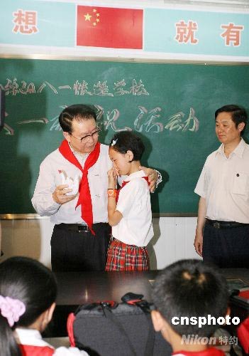 中共中央政治局常委李長(zhǎng)春,6月1日赴四川災(zāi)區(qū)看望慰問(wèn)災(zāi)區(qū)兒童,向?yàn)?zāi)區(qū)轉(zhuǎn)移安置和受傷治療的學(xué)生轉(zhuǎn)交中央宣傳文化部門(mén)贈(zèng)送的十萬(wàn)臺(tái)收音機(jī)和一批少兒讀物及學(xué)習(xí)用品。中新社發(fā) 蒲滔 攝