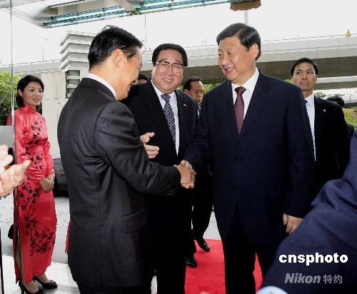 七月七日,中國國家副主席習近平(右)在中央駐港聯(lián)絡(luò)辦公室接見中央駐港機構(gòu)和中資機構(gòu)負責人,中聯(lián)辦主任高祀仁(中)及多位副主任到門口迎接。中新社發(fā) 王麗南 攝