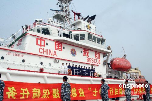 9月21日下午,中國裝備最先進(jìn)、救助功能最全的大馬力遠(yuǎn)洋專用救助船“南海救一一二”輪一切準(zhǔn)備就緒,從上海外高橋碼頭出征西太平洋海域,待命深海執(zhí)行神舟七號(hào)載人航天飛行任務(wù)海上應(yīng)急救援任務(wù)。中新社發(fā) 陸從兵 攝