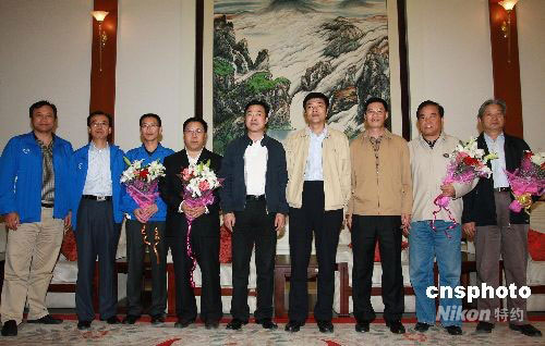9月26日,在酒泉衛(wèi)星發(fā)射中心完成“神舟七號(hào)”發(fā)射任務(wù)后,北京航天科技集團(tuán)運(yùn)載火箭研究院第一批航天工作者返京,北京火箭專家機(jī)場(chǎng)在機(jī)場(chǎng)接待廳里與航天工作者合影留念。中新社發(fā) 鄭雄增 攝