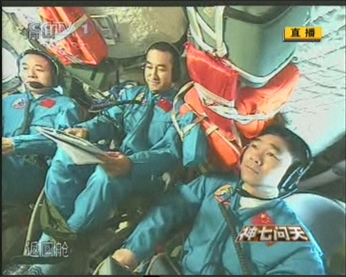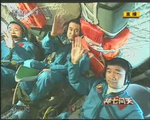 北京時(shí)間9月27日傍晚,在成功實(shí)施出艙活動(dòng)后,航天員回到返回艙,與在北京航天飛行控制中心的中共中央總書記、國(guó)家主席、中央軍委主席胡錦濤進(jìn)行天地通話。