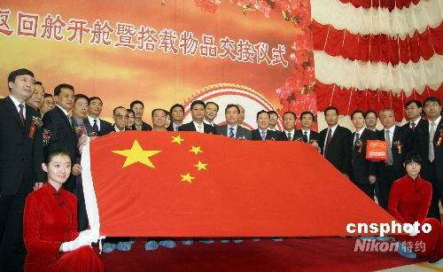10月1日上午,神舟七號(hào)載人飛船返回艙在其誕生地——中國(guó)航天科技集團(tuán)公司所屬中國(guó)空間技術(shù)研究院舉行開艙暨搭載物交接儀式,伴隨三位中國(guó)航天員太空飛行六十八小時(shí)二十七分鐘的一批特殊“乘客”一一精彩亮相,隨后各歸其主。圖為出席儀式各方面負(fù)責(zé)人合影留念。中新社發(fā) 孫自法 攝