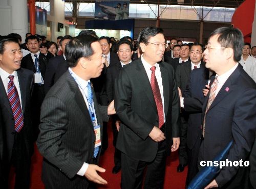 2008年11月4日第七屆中國航展在珠海盛大舉行,中共中央政治局委員、國務(wù)院副總理張德江,中共中央政治局委員、廣東省委書記汪洋在南航集團(tuán)總經(jīng)理、南航股份公司董事長劉紹勇的陪同下參觀了南航展臺。中新社發(fā) 羅廣泰 攝