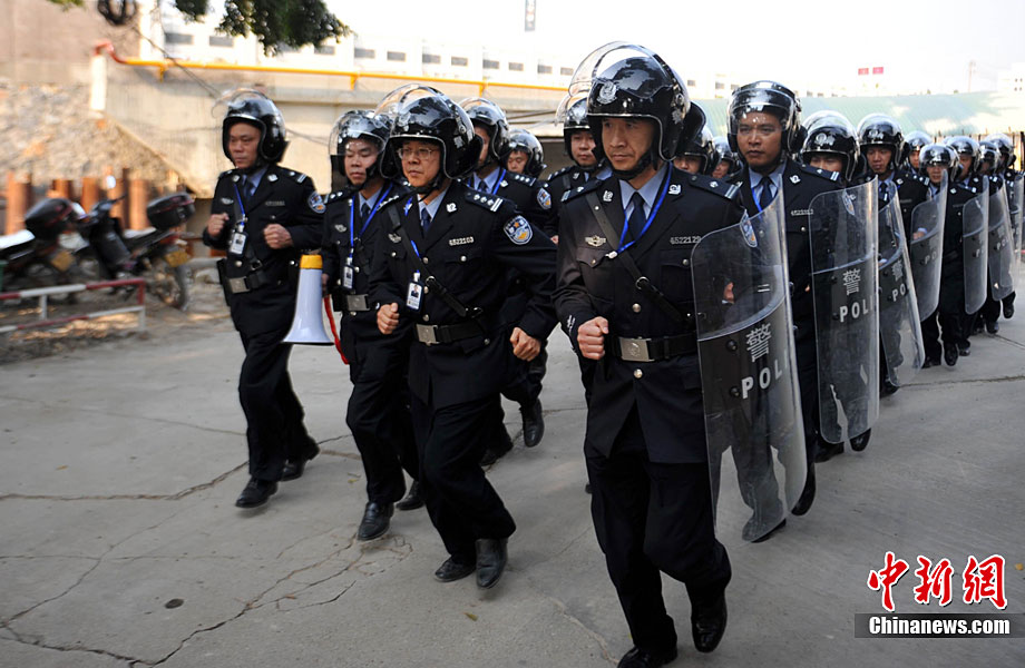 11月11日下午,為提高監(jiān)獄安全防范和及時有效處置突發(fā)事件的能力,廣西監(jiān)獄局組織駐南寧監(jiān)獄單位進行了制暴追逃預(yù)案應(yīng)急處置實戰(zhàn)演練。本次制暴追逃演練是駐南寧市監(jiān)獄單位和武警、公安交警應(yīng)對突發(fā)事件的首次聯(lián)合大練兵。參與警力達260余人!笆掳l(fā)監(jiān)獄”在周邊監(jiān)獄單位、武警官兵、公安民警的權(quán)利配合下,成功處置4名“罪犯”企圖制造騷亂、趁機越獄脫逃“事件”。中新社記者 蔣雪林 攝