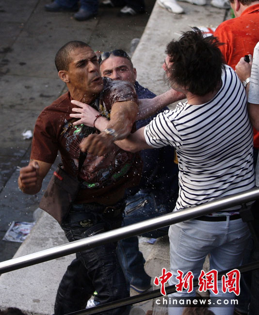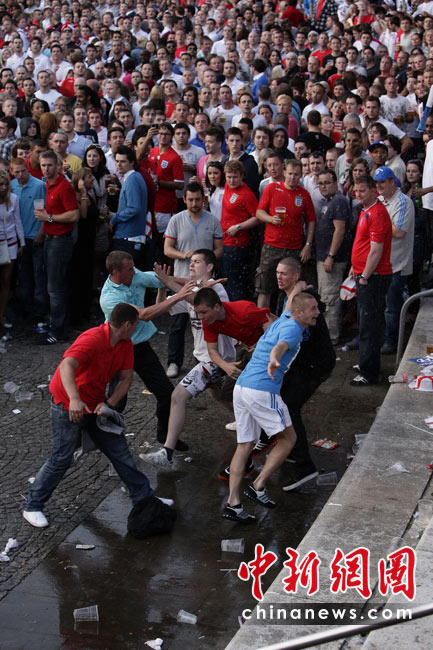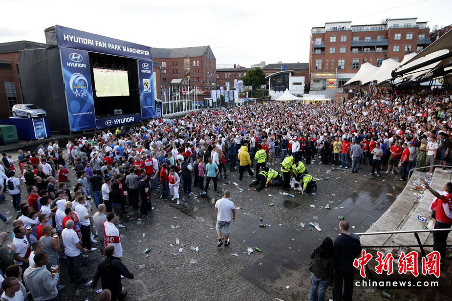 6月11日,南非世界杯揭幕戰(zhàn)在約翰內(nèi)斯堡足球城球場(chǎng)舉行,中場(chǎng)休息時(shí)球迷在休息區(qū)舉箱豪飲啤酒。中新社記者 廖攀 攝