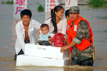 江西第二大河流撫河干流發(fā)生超歷史洪水,撫河唱凱堤21日傍晚決口,嚴(yán)重威脅下游5個鄉(xiāng)鎮(zhèn)14.5萬人口的安全。南京軍區(qū)戰(zhàn)士和群眾一起解救被洪水圍困的婦女和小孩,泡沫箱成了“生命小舟”。何柳斌 攝