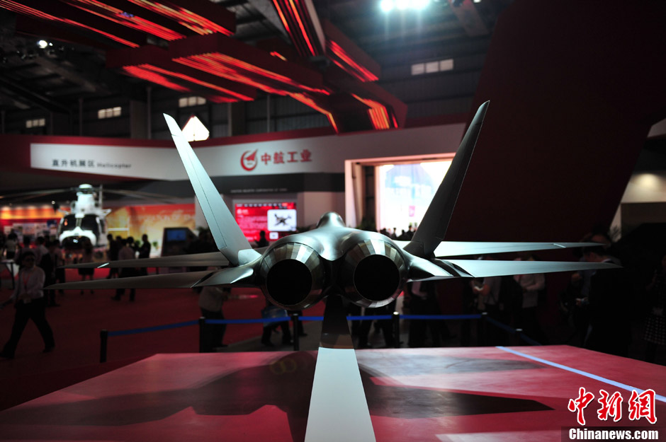 11月13日上午,第九屆中國(guó)國(guó)際航空航天博覽會(huì)在廣東珠海開幕,一架中國(guó)先進(jìn)戰(zhàn)斗機(jī)概念模型在中航工業(yè)展臺(tái)亮相,從外形上看,與前不久成功試飛的殲31相似,備受關(guān)注。中新社發(fā) 柯小軍 攝