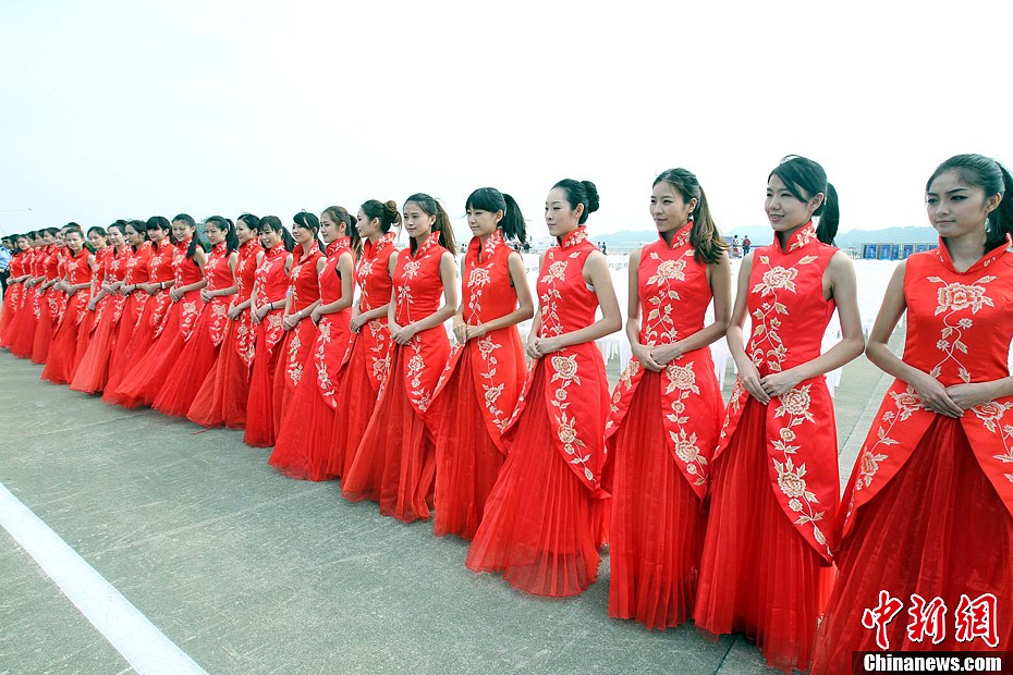 11月12日,準備為珠海第九屆中國航展開幕式服務的禮儀小姐在風中彩排,成為亮麗的風景線。中新社發(fā) 洪少葵 攝