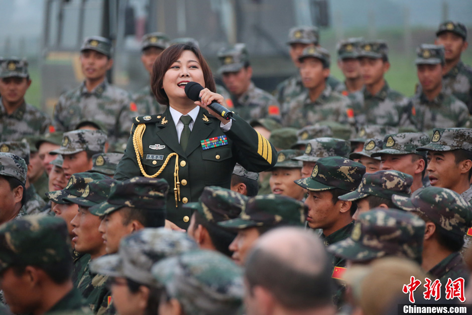 8月10日,隨同中方參演部隊(duì)赴俄羅斯參加“和平使命-2013”中俄聯(lián)演的沈陽軍區(qū)政治部文工團(tuán)演員們,為中俄千余名參演官兵獻(xiàn)上了一場(chǎng)精彩的文藝晚會(huì)。豐富多彩的文藝節(jié)目,將位于切巴爾庫(kù)爾訓(xùn)練場(chǎng)的中俄聯(lián)演野營(yíng)村,變成了友誼的盛會(huì)、歡樂的海洋。 圖為演唱歌曲《當(dāng)那一天來臨》。中新社發(fā) 李祥輝 攝