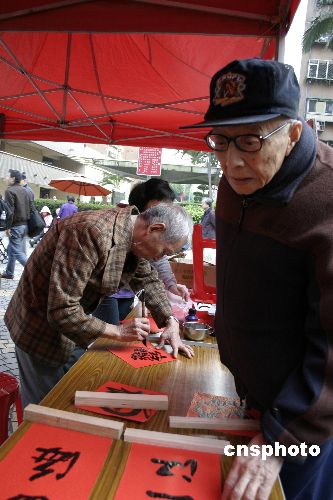 十二月十四日,二00七臺(tái)北眷村文化節(jié)開(kāi)幕,老人們?cè)诨顒?dòng)現(xiàn)場(chǎng)書(shū)寫(xiě)對(duì)聯(lián)。中新社發(fā) 陳國(guó)華 攝
