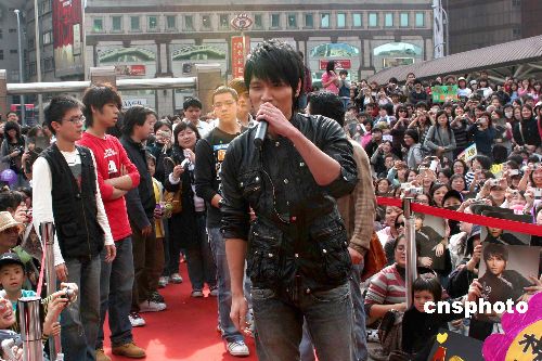 一月六日,臺(tái)灣當(dāng)紅歌星楊宗緯在臺(tái)北車站南二門(mén)廣場(chǎng)為他即將出版的新專輯預(yù)購(gòu)造勢(shì)。圖為楊宗緯抵達(dá)現(xiàn)場(chǎng)時(shí)受到歌迷的歡迎。中新社發(fā) 陳立宇 攝