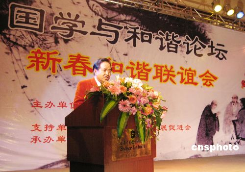一月十一日,世界華人聯(lián)合總會(huì)會(huì)長賀興桐,在廣西北海市召開的全球華商“國學(xué)與和諧論壇暨新春和諧聯(lián)誼會(huì)”上致辭。當(dāng)日,來自海內(nèi)外五百余名華人華商匯聚該論壇,縱論“國學(xué)與和諧”,共商廣西北部灣經(jīng)濟(jì)區(qū)及中國西部地區(qū)的創(chuàng)業(yè)大計(jì)。中新社發(fā) 馮抒敏 攝