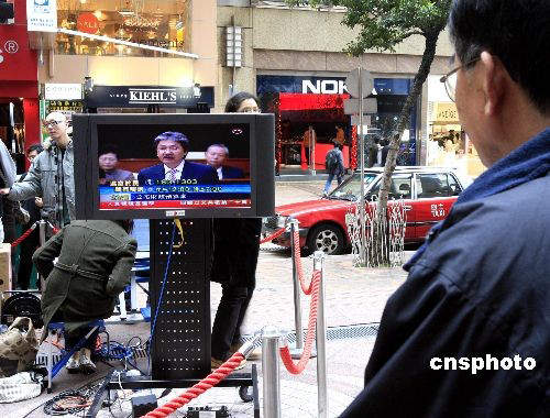 二月二十七日,香港財政司司長曾俊華向立法會提交二零零八至零九年度財政預(yù)算案,公布政府綜合盈余達一千一百五十六億元,創(chuàng)歷來新高,并推出多項減稅和惠及社會的措施。當?shù)仉娨暸_街頭直播曾俊華作報告,并收集市民意見。中新社發(fā) 王麗南 攝