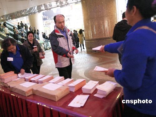 二月二十七日,香港財(cái)政司司長曾俊華向立法會提交二零零八至零九年度財(cái)政預(yù)算案,公布政府綜合盈余達(dá)一千一百五十六億元,創(chuàng)歷來新高,并推出多項(xiàng)減稅和惠及社會的措施。圖為有關(guān)組織街頭派發(fā)財(cái)政預(yù)算案摘要小冊子給市民。中新社發(fā) 王麗南 攝