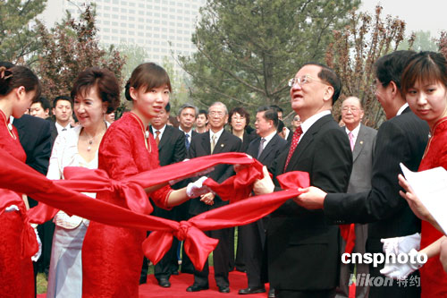 4月29日,中國國民黨榮譽(yù)主席連戰(zhàn)在北京奧林匹克體育中心區(qū)為雕塑“水袖”揭幕。廖文靜 攝