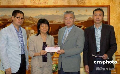五月十三日,澳門中聯(lián)辦副主任徐澤(右二)接受盧德華女士(左二)交來的二十五萬元港幣善款。這是五位澳門四川省政協(xié)委員捐助,用于救助四川地震災(zāi)民的善款。中新社發(fā) 史利 攝