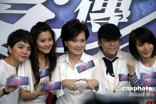 臺(tái)灣演藝界人士將于18日晚共同參與四川賑災(zāi)晚會(huì)“把愛(ài)傳出去”。張小燕、張菲、吳宗憲、蔡康永、周杰倫等知名藝人接到邀請(qǐng)并積極投入晚會(huì)籌備工作,圖為名主持沈春華(中)、蔡康永(右二)與演唱組合SHE號(hào)召民眾以及更多藝人參與晚會(huì)及募款活動(dòng)。中新社發(fā) 劉舒凌 攝
