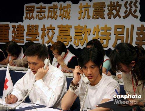 十七日,臺(tái)灣一電視臺(tái)與香港電視臺(tái)聯(lián)線舉辦“眾志成城抗震救災(zāi)重建學(xué)校募款特別報(bào)道”,協(xié)助四川震災(zāi)過后學(xué)校重建。圖為臺(tái)北市市長(zhǎng)郝龍斌與歌手王力宏加入募款行列,擔(dān)任捐款專線接線志工,共襄義舉。中新社發(fā) 劉舒凌 攝