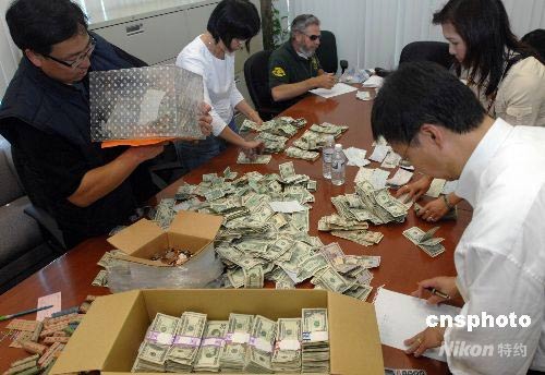 當(dāng)?shù)貢r間五月十七日,四川大地震發(fā)生后的第一個周末,在洛杉磯地區(qū)工作生活的普通華人華僑頂著華氏一百度的高溫走上街頭,為遠(yuǎn)隔萬里的災(zāi)區(qū)同胞默默捐出一張張現(xiàn)金和支票。短短六個小時的街頭募捐活動共籌得四十萬美元。圖為羅省中華總商會會長莊佩源(左一)等人正在清點部分捐款。中新社發(fā) 張煒 攝