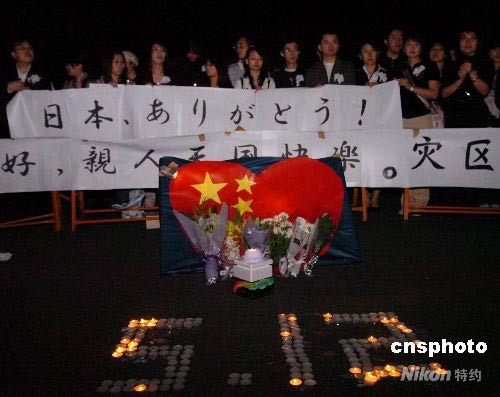 5月18日晚,150余位在日華人華僑和留學(xué)生自發(fā)來到東京市中心的新宿中央公園舉行燭光祈;顒樱磕5·12四川大地震遇難者。他們胸戴小白花、手持蠟燭,并打出“孩子一路走好”、“親人天國快樂”、“災(zāi)區(qū)人民挺住”等橫幅。中新社發(fā) 朱沿華 攝