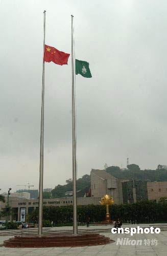 五月十九日八時整,澳門蓮花廣場降半旗,向四川大地震遇難同胞致哀。中新社發(fā) 史利 攝