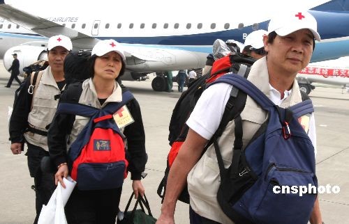 5月20日下午,以陳文長為領(lǐng)隊的臺灣紅十字醫(yī)療隊一行37人以“兩岸直航”的形式乘坐臺灣華信航空的專機(jī)抵達(dá)成都機(jī)場,之后即刻前往汶川大地震的重災(zāi)區(qū)德陽市開展醫(yī)療救治。中新社發(fā) 任晨鳴 攝