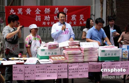 五月二十三日上午,國民黨“立委”周守訓(xùn)(左三)與“牛媽媽公益之家”合辦(左二為牛媽媽),在臺灣“立法機(jī)關(guān)”內(nèi)義賣黃金餅,收入將全部捐給臺灣紅十字會,作為四川震災(zāi)后的重建基金,該活動得到不少“立委”和工作人員的支持。中新社發(fā) 陳立宇 攝