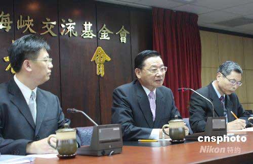 海協(xié)會與海基會即將恢復(fù)協(xié)商會談。六月十日中午,海峽交流基金會董事長江丙坤(中)、副董事長兼秘書長高孔廉(右一),在;鶗邩堑谝粫h室舉行赴北京商談前的特別記者會。六月十一日,江丙坤將率代表團(tuán)赴北京。 江丙坤說:“明天,我們開始進(jìn)行的是一項(xiàng)舉世矚目的活動,大家都在寫歷史!敝行律绨l(fā) 耿軍 攝