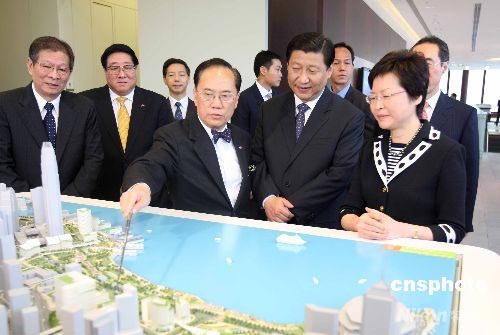 七月七日,首次訪問香港的國家副主席習(xí)近平,來到金融管理局參觀貨幣及銀行體系展覽,同時了解港粵、港深合作情況。中新社發(fā) 任海霞 攝