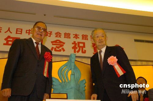9月5日,日本財(cái)團(tuán)法人日中友好會(huì)館舉行大型酒會(huì)慶祝該會(huì)本館建館20周年,中國日本友好協(xié)會(huì)會(huì)長宋健、中國駐日大使崔天凱、日本眾院議長河野洋平等數(shù)百名中日友好人士出席。圖為宋健會(huì)長(左)代表中方向日中友好會(huì)館會(huì)長林義郎先生贈(zèng)送賀禮——雕塑作品《鳳凰》。中新社發(fā) 朱沿華 攝