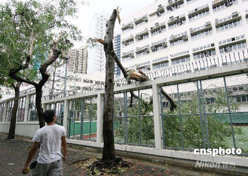臺(tái)風(fēng)“黑格比”襲過(guò)香港后,九月二十四日早減弱為三號(hào)強(qiáng)風(fēng),香港所有上午校及全日制學(xué)校繼續(xù)停課。圖為灣仔區(qū)一棵大樹(shù)被吹折,倒落于一中學(xué)的操場(chǎng)內(nèi)。中新社發(fā) 武仲林 攝