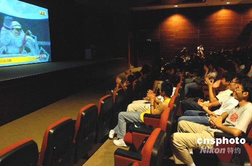 二十七日下午四時(shí)許,兩三百名澳門科技大學(xué)師生在學(xué)校禮堂收看“神舟七號(hào)”航天員出艙活動(dòng)電視直播,不斷為中國(guó)航天員喝彩。中新社發(fā) 畢永光 攝