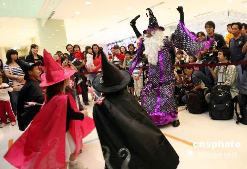 十月七日,香港海港城舉行迎接萬圣節(jié)活動(dòng),一群調(diào)皮的小朋友與魔法師跳舞狂歡,營(yíng)造氣氛。中新社發(fā) 洪少葵 攝