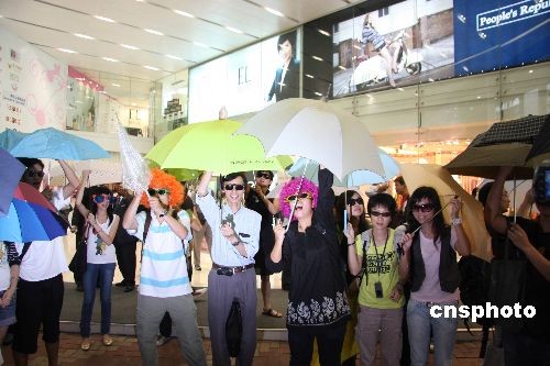 十月十日晚,香港一環(huán)保團(tuán)體組織了一次五分鐘的反對(duì)光污染“快閃”行動(dòng)。手持五顏六色雨傘、佩戴墨鏡的抗議者在皇室堡商場(chǎng)門(mén)前的行人路上“漫游”。中新社發(fā) 陳京松 攝